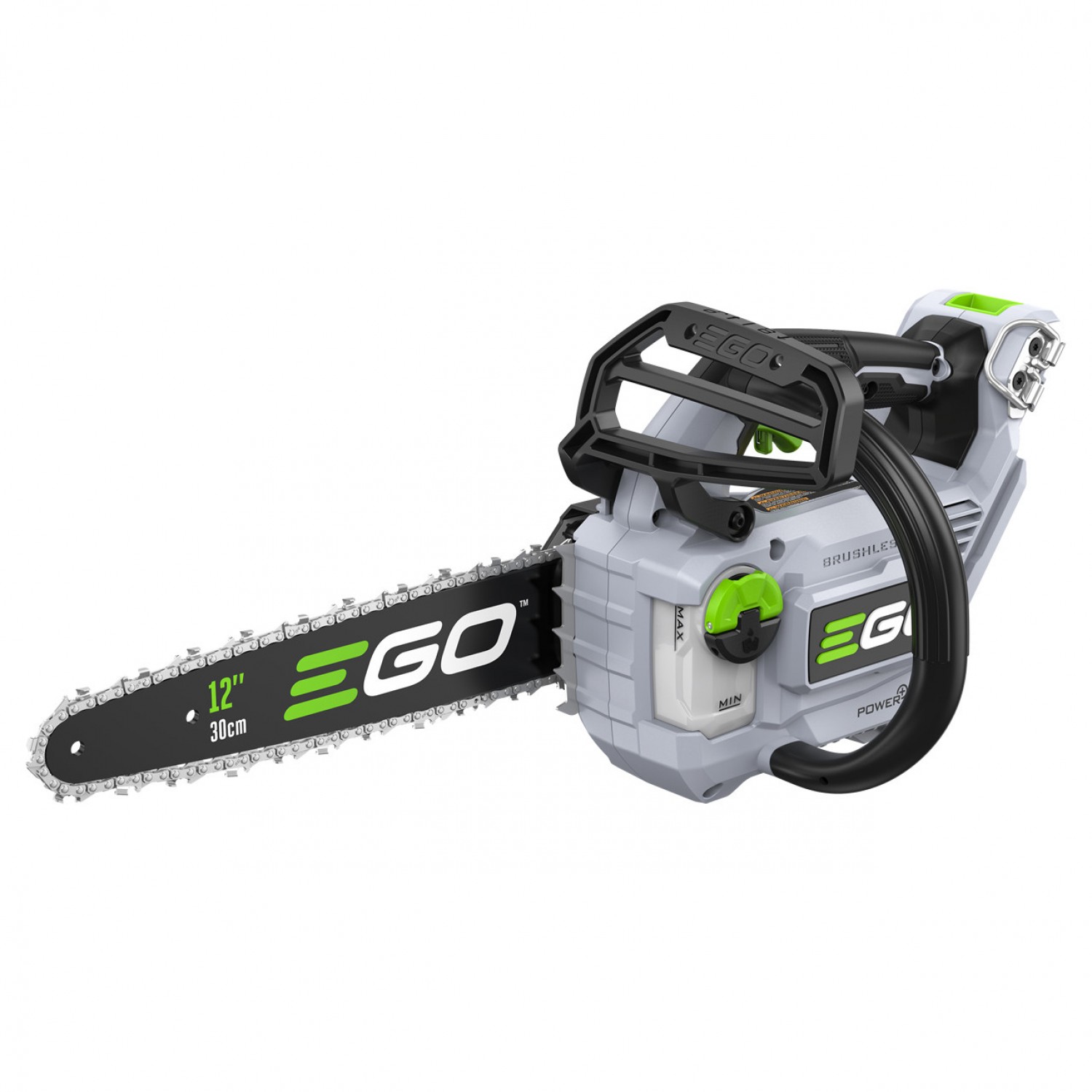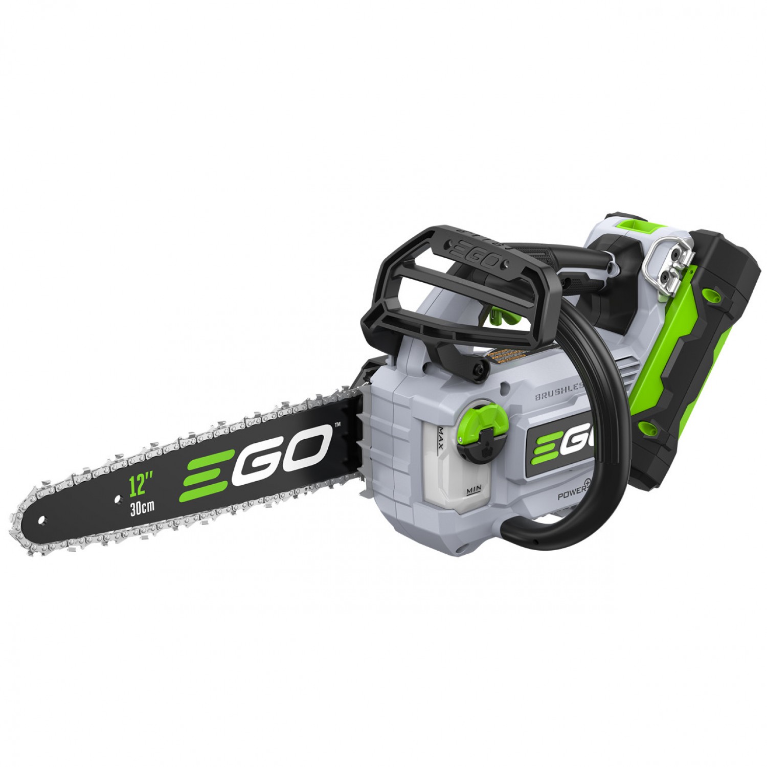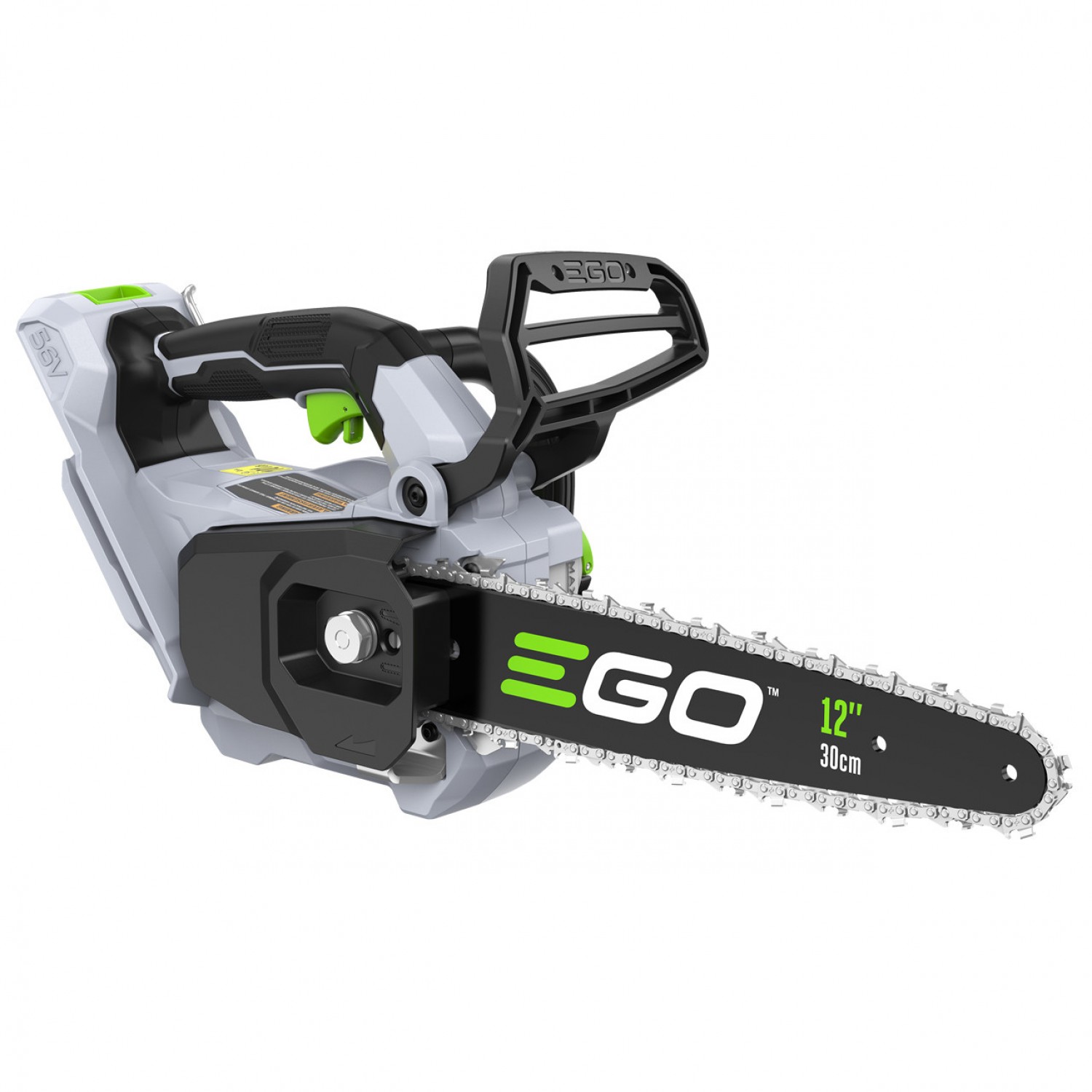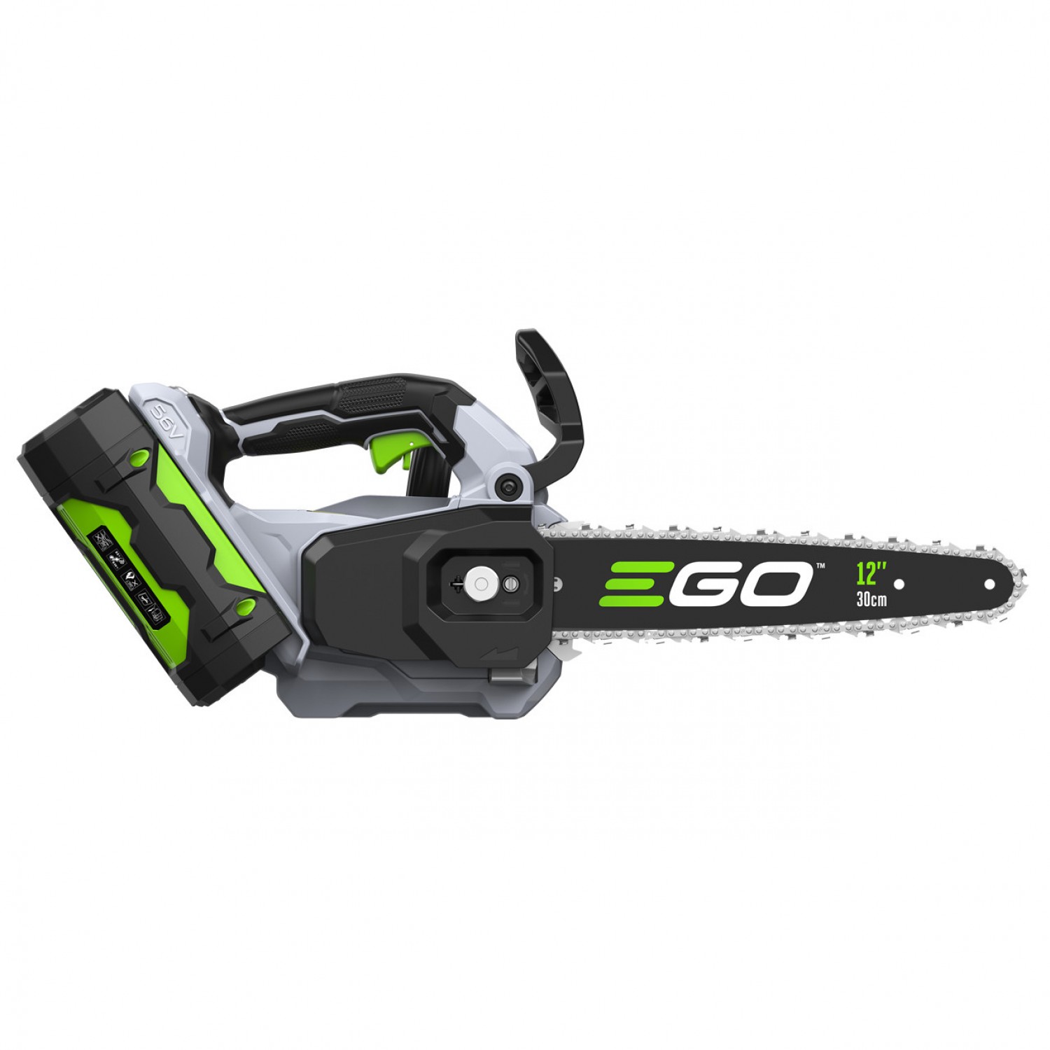 EGO CS1200E - компактна електропила професійного класу, що має потужність бензинової ланцюгової пили об'ємом 30 куб. см, але при цьому має компактну і легку конструкцію, не створює шуму, не виділяє вихлопних газів і не вимагає складного налаштування. Її високоефективний безщітковий двигун забезпечує швидкість ланцюга до 20 м/с, що дозволяє виконувати швидкі і чисті пропили. Компактна ланцюгова пила важить всього 3,5 кг з встановленою батареєю EGO 56V 2,5Ah ARC Lithium™, що знижує втомлюваність і робить її ідеальною для легких робіт з видалення чагарнику, обрізки гілок і т. д. Ця компактна бездротова ланцюгова пила забезпечує до 130 пропилів бруса 10x10 см за одну зарядку за допомогою батареї 2,5Ah. Пила оснащена 12-дюймовою шиною і ланцюгом з автоматичним змащенням. Конструкція з класом захисту IPX4 забезпечує додаткову міцність в несприятливих погодних умовах.